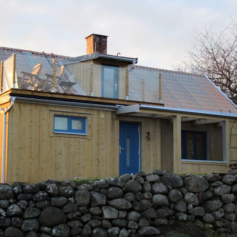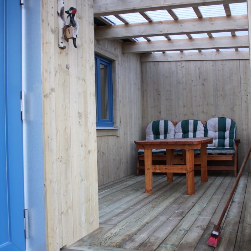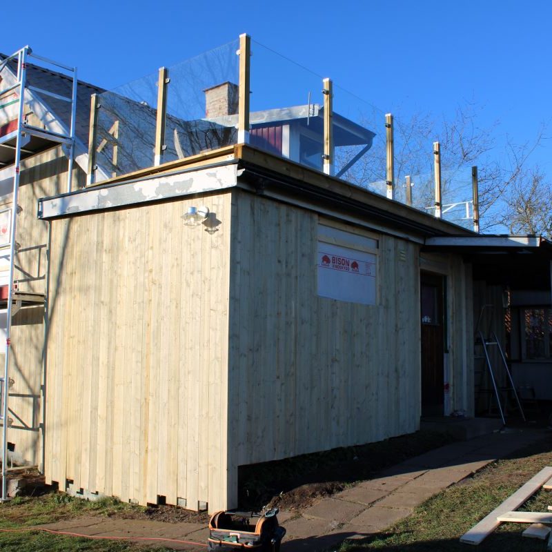 Under den första fasen av detta projekt har även vissa andra arbeten utförts, d.v.s. en komplett plåtläggning på taket, byte av hängrännor, takbeslag och vindskivor. Dessutom har vi täckt skorstenen med plåt och försett den med en kupa. Vi kom även överens med vår kund om renovering av altanen på baksidan av huset: vi bytte plasttaket, hängrännan och golvet, plockade bort ett fönster och täckte väggarna med träpaneler m.m. Även kundens blomsterrabatt har fått ”ansiktslyft”: vi bytte gamla ruttna trästockar mot grå stenar.