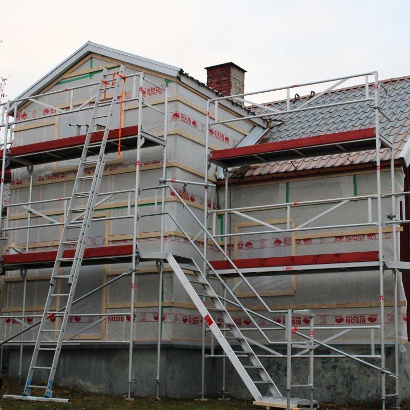 Sen köpte vi allt nödvändigt material och levererade det till vår nya byggarbetsplats. I väntan på leveransen av fönstren och dörrarna påbörjade vi vårt arbete på ett bestämt datum genom att riva ytterväggar och förbereda de inför värmeisoleringen. Vi beställde en speciell container för byggavfall också.